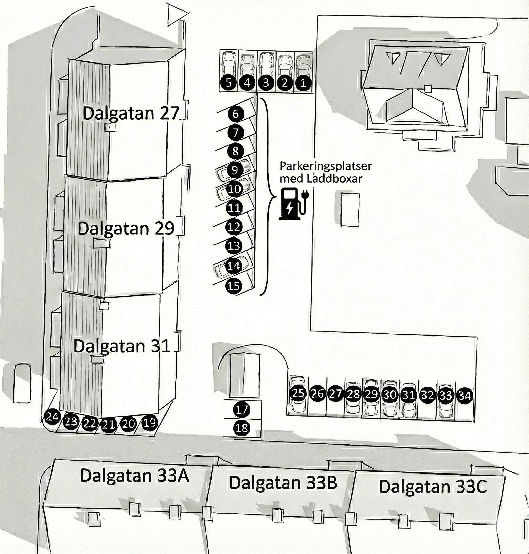 parkeringarna framför portarna 27, 29 och 31. Nummer 6 till 15. Dessa kommer att knytas till respektive medlem nu på måndagen den 22:a dec som har dessa parkeringar. Mer info skickas ut till er.